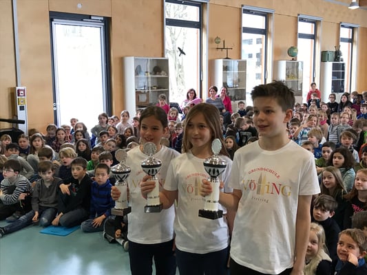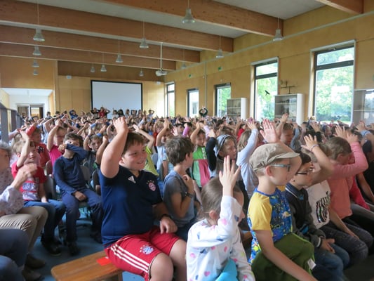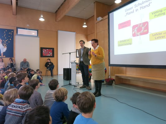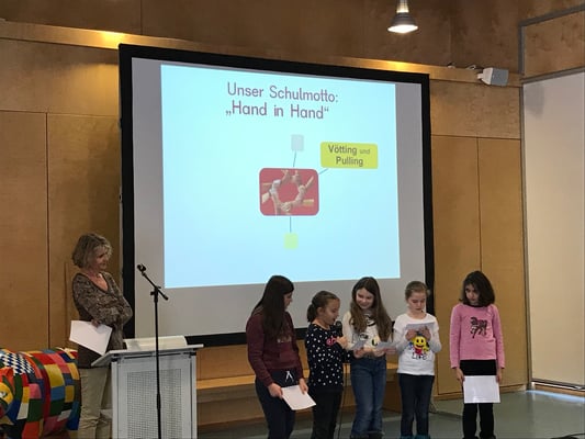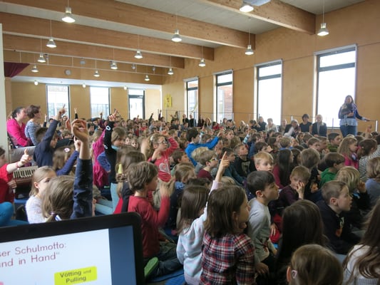 In einer Schulversammlung am 19. März 2018 haben wir unser Motto „Hand in Hand“ und das neue Logo allen Kindern unserer Schule vorgestellt. Mehrere Gäste haben sich für uns Zeit genommen und Ihren Beitrag zu unserem Schulleben selbst vorgestellt, das nur „Hand in Hand“ mit vielen verschiedenen Personen und Institutionen gelingen kann: