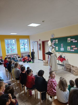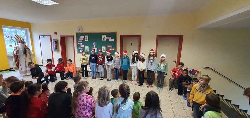 Auch im Schulhaus Pulling schaute der Nikolaus vorbei und brachte für jede Klasse etwas mit. Dort rappte die 4. Klasse für ihn das Gedicht "Knecht Ruprecht" von Theodor Storm.