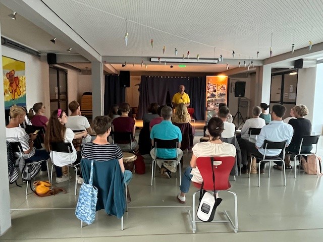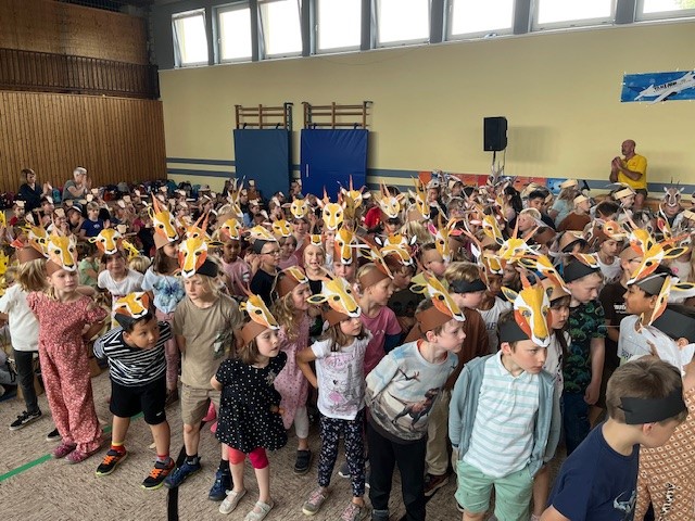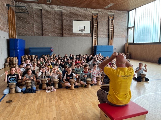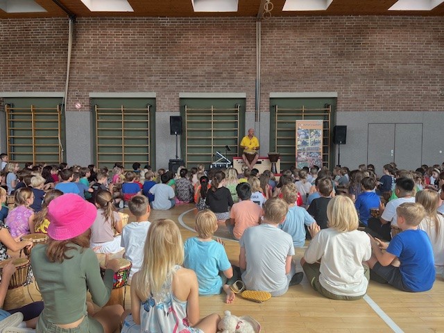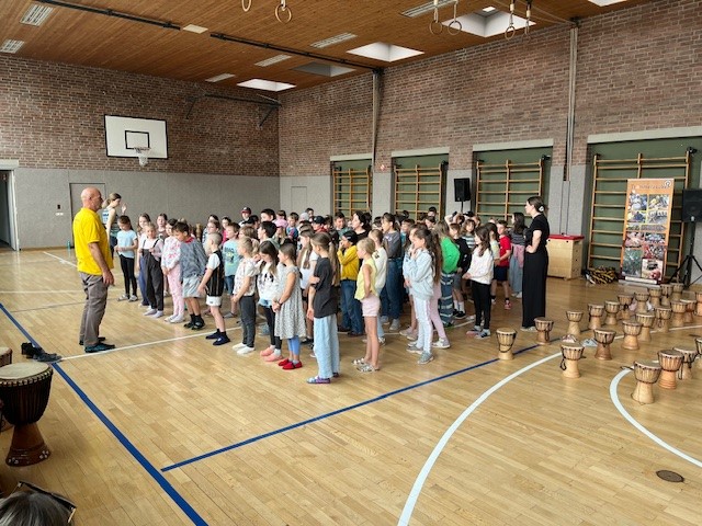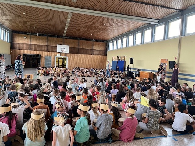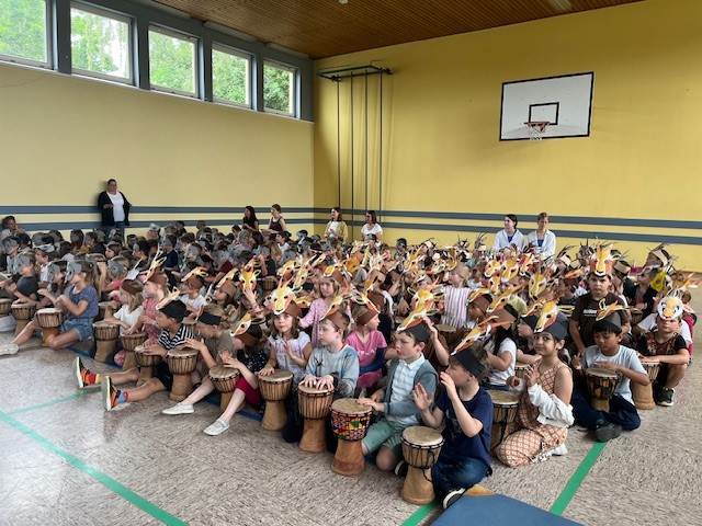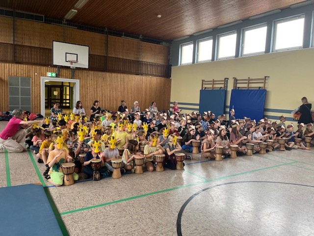 Alle an die Trommeln - so hieß es jeden Morgen in unserer Trommelzauber- Projektwoche. Mit einer gemeinsamen Trommelstunde für alle Kinder und Lehrkräfte stimmte uns Otto Klösl vom "Trommelzauber" auf einen Tag voll afrikanischer Trommelklänge ein. Im Anschluss durften dann die einzelnen Klassenstufen eine weitere Stunde mit Otto trommeln. Dabei wurden die Lieder für das Musical "Tambo Tambo" eingeübt, das wir dann am Freitag - unserem großen Sommerfesttag - der ganzen Schulfamilie präsentierten. Neben den Trommelstunden gab es für die Schülerinnen und Schüler in ihren Klassen weitere Aktionen rund um das Thema "Trommeln" - so wurden z.B. die Masken und Kulissen für die Aufführung gebastelt, eigene Trommeln hergestellt und viel weiteres Wissen über Afrika vermittelt. Auch am Elternabend, den Otto für alle Interessierten angeboten hat, wurde kräftig getrommelt.