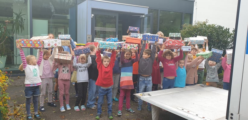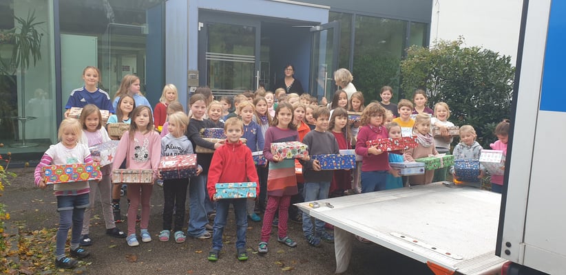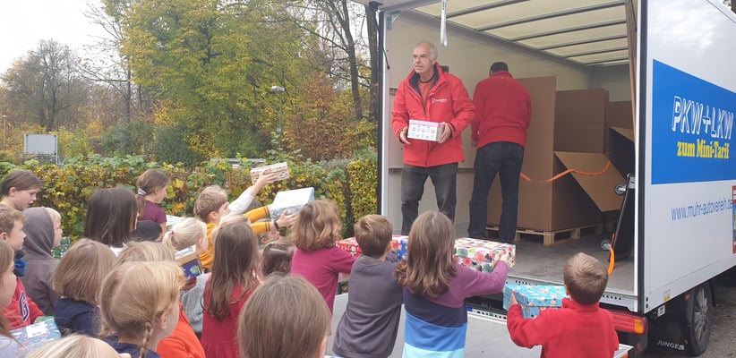 Unsere Schule unterstützte die Aktion "Geschenk mit Herz" wieder mit vielen Päckchen, die von unseren Schüler und deren Eltern liebevoll gepackt wurden. Beim Einladen der Päckchen in den Humedica Lastwagen halfen dann auch alle Schüler, die ein Päckchen mitgebracht hatten, kräftig mit. Herzlichen Dank an alle Spender und Frau Engemann für die Organisation dieser schöne Aktion.