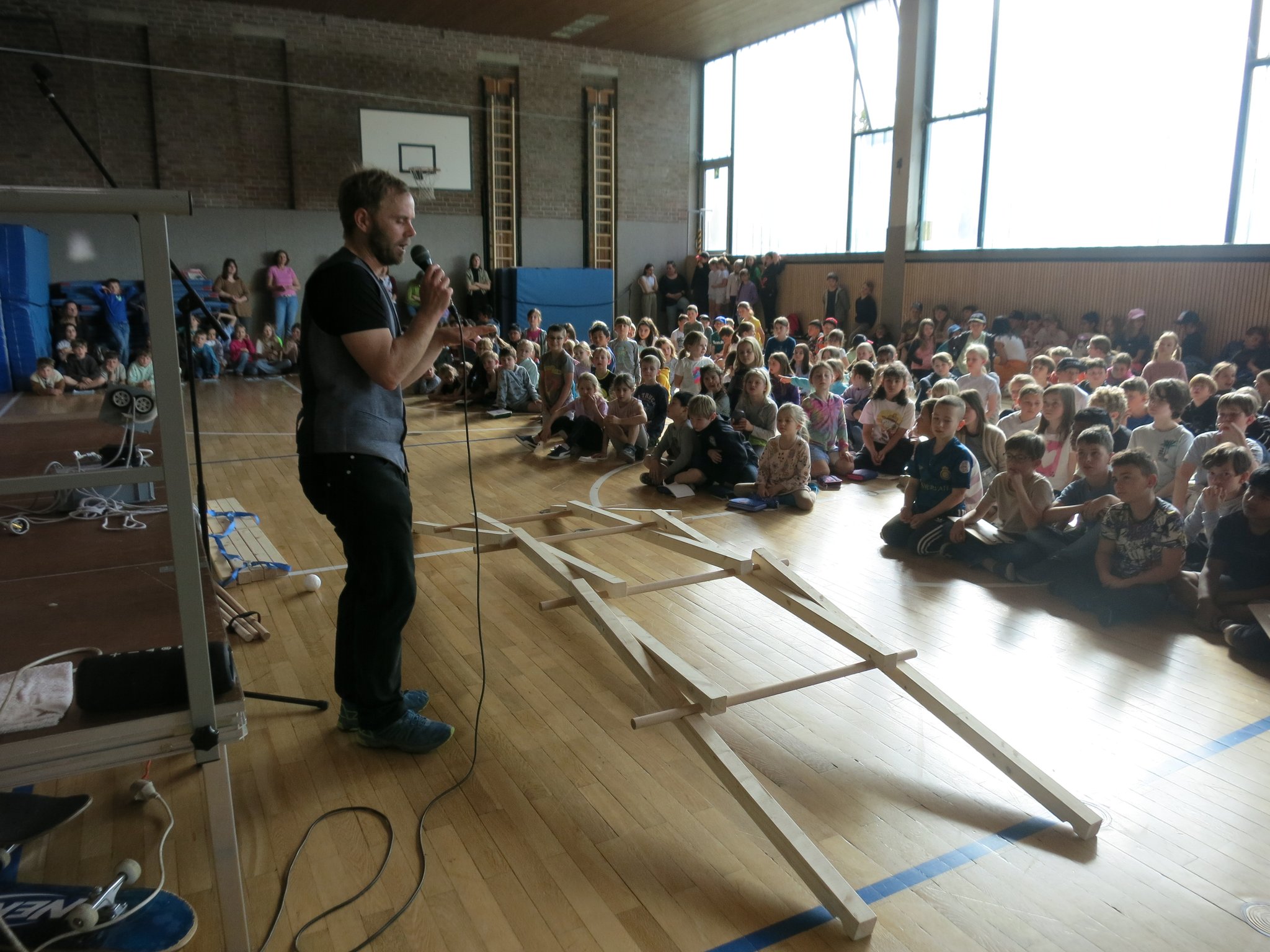 Eine kleine Schlussshow, bei der auch noch eine große Leonardobrücke aufgebaut und auf ihre Stabilität hin getestet wurde, rundete diesen außergewöhnlichen Schultag perfekt ab.