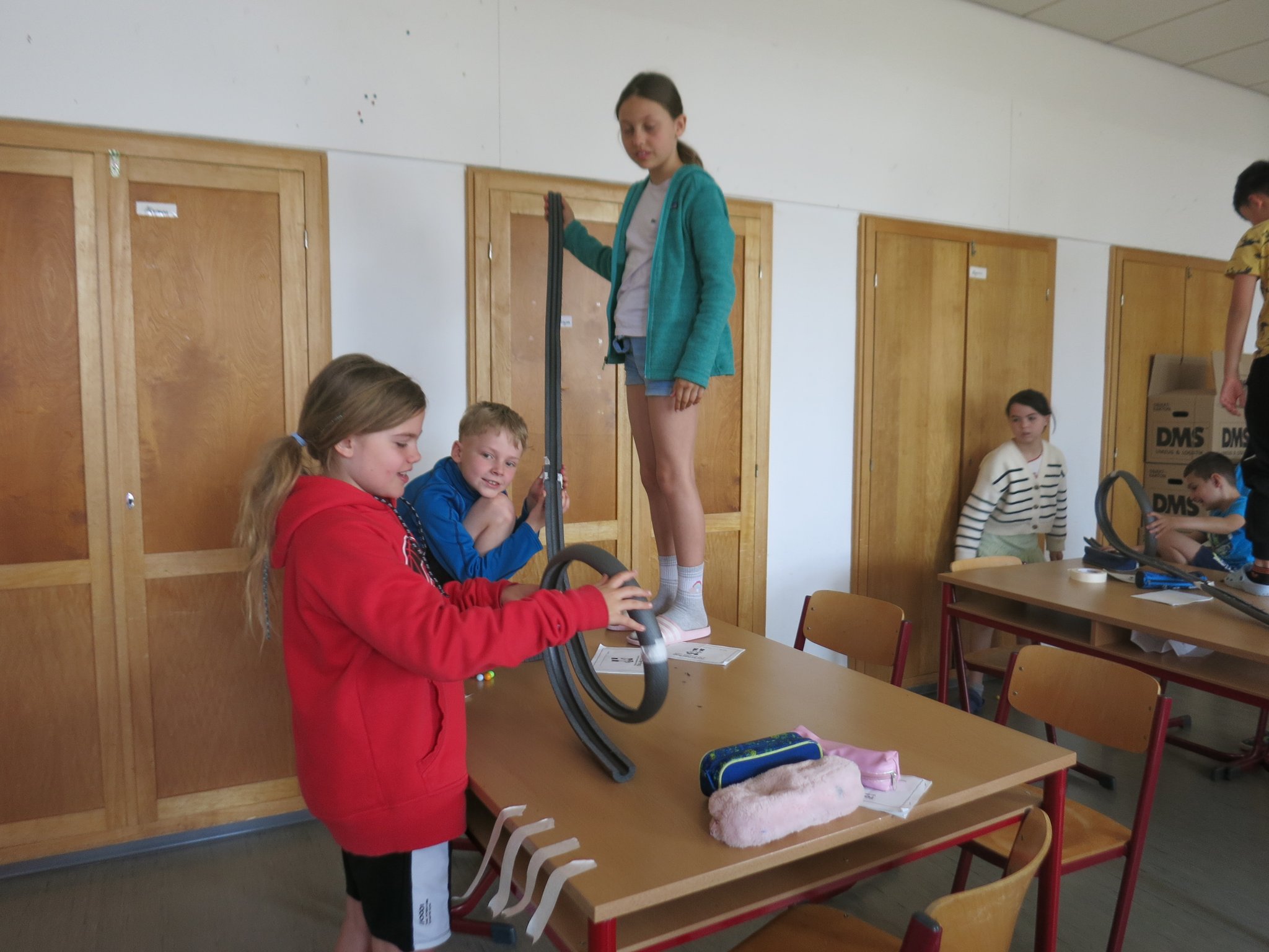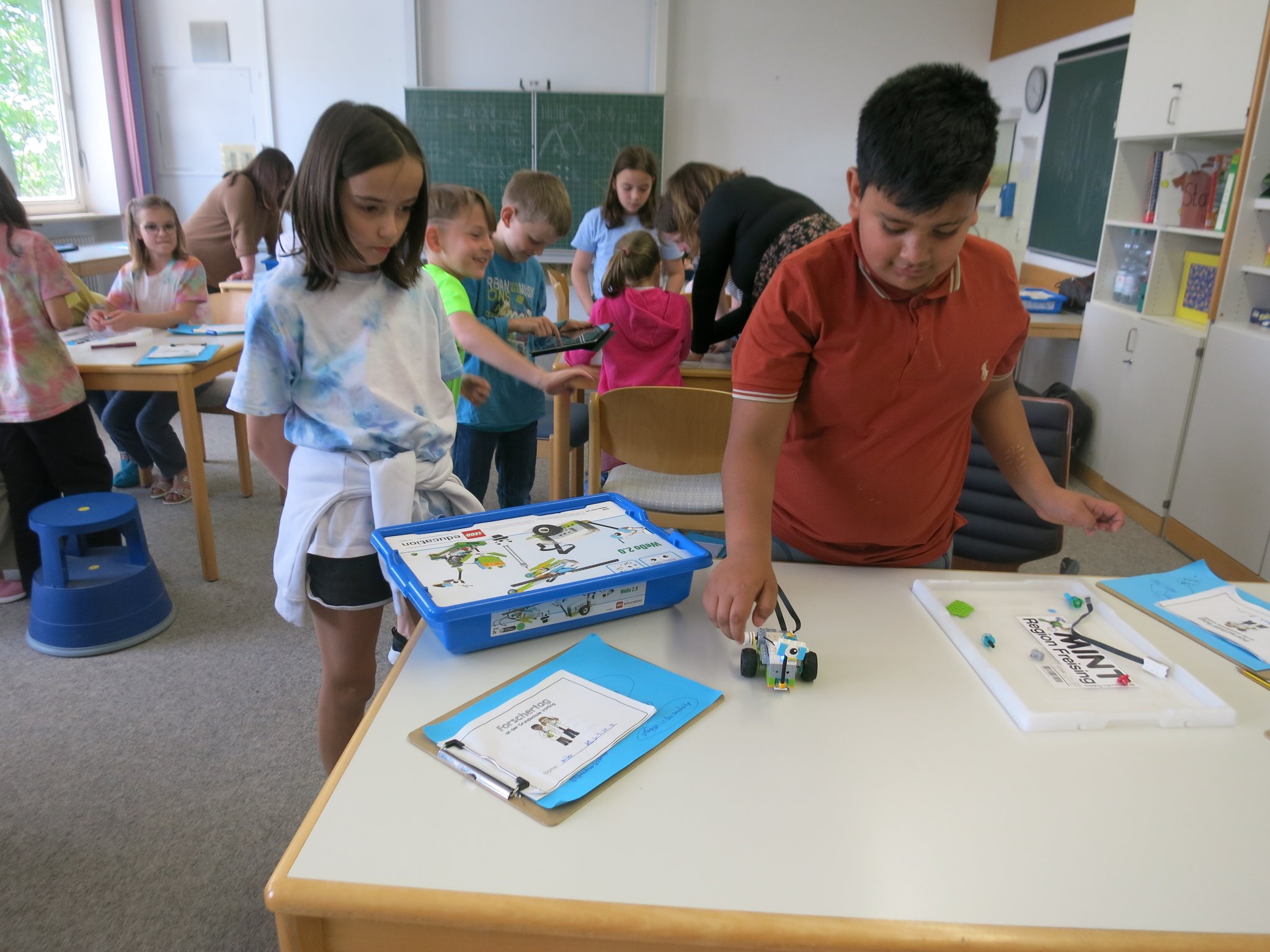 Im Anschluss durften die Kinder nun selbst experimentieren und forschen. Vom Bauen von Brücken, Robotern, Kugelbahnen, Türmen oder Legomaschinen, bis hin zur Konstruktion flugfähiger Raketen aus Papier und der Beschäftigung mit chemischen Reaktionen und Farbexperimenten konnten an 14 Stationen, die im ganzen Schulhaus verteilt waren, verschiedenste Erkenntnisse gewonnen werden. In einem Forscherheft wurden dann alle wichtigen Fragen, Versuche und Ergebnisse von den Schülern notiert.